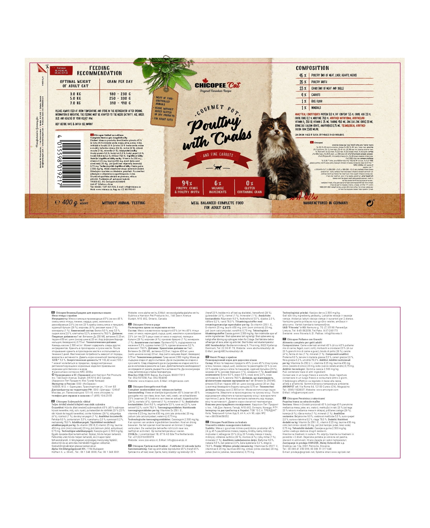 67% Fleisch und tierische Nebenerzeugnisse (davon 45% vom Geflügel aus Fleisch, Leber, Herzen, Hälse;), 23% Weich- und Krebstiere (davon 23% Krabben aus Fleisch, Schalen), 26% Geflügelbrühe, 4% Karotten, 1% Reismehl, 1% Mineralstoffe.